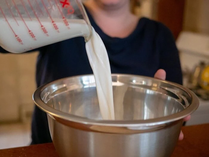 - ۱ لیوان شیر یا آب که در مواد لازم داشتیم را داخل ظرف ریخته و شکر را به آن اضافه و مخلوط می کنیم.