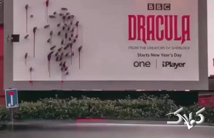بیلبورد تبلیغاتی فیلم دراکولا با استفاده از فناوری نور و سایه تنها موقع شب و تاریکی نمایش داده میشود. این نوع تبلیغات با تکنیکهای نوری یا سایه طراحی شده تا در شب جلوهای ترسناک و تعاملی ایجاد کند.