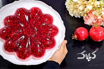 مواد لازم: دو بسته ژله انار، سه لیوان آب جوش، دانه انار به میزان دلخواه، نصف پاکت خامه صبحانه، یک بسته بیسکوییت پتی بور