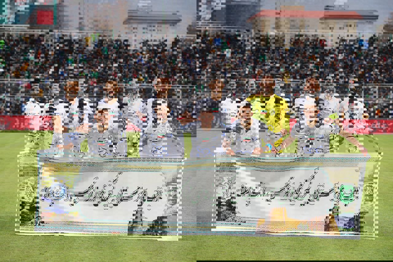 * همزمان با مراتب ابتدای مسابقه، بازیکنان خیبر به نشانه اتحاد دست در دست هم آماده این بازی شدند.