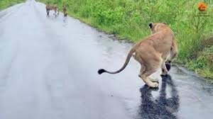 این شیر ماده که در جریان طوفانها و سیلابهای اخیر در پارک ملی کروگر برای شکار از گروه خود دور شده بود، تولهها و گلهاش را گم کرد، اما هنگامی که در امتداد جاده حرکت میکرد، ناگهان تولهشیرهایی را پشت سر خود در جاده دید.