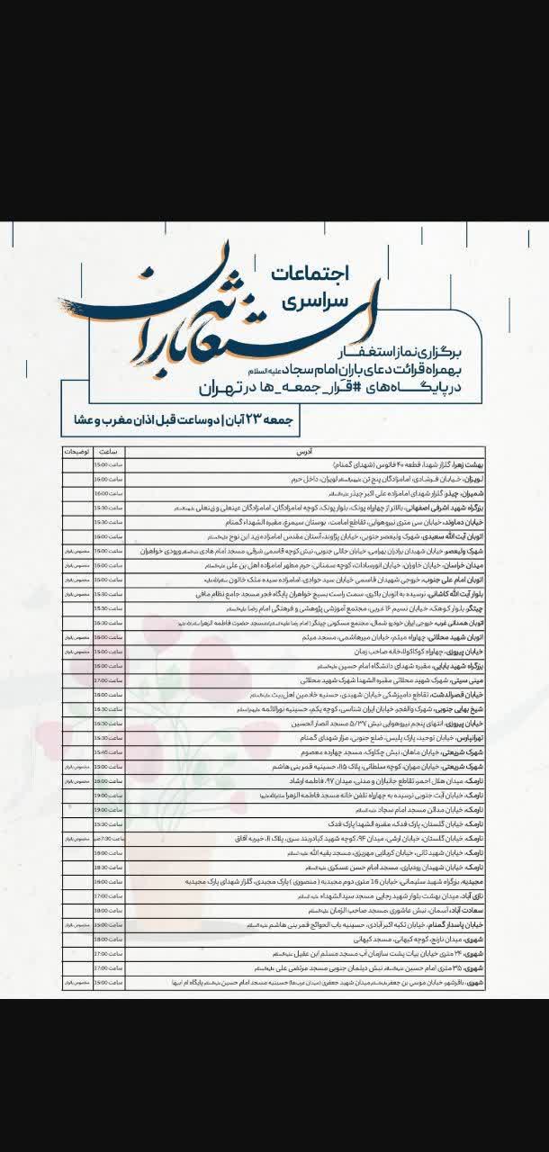 - اللَّهُمَّ اسْقِنَا الْغَیْثَ ، وَ انْشُرْ عَلَیْنَا رَحْمَتَکَ بِغَیْثِکَ الْمُغْدِقِ مِنَ السَّحَابِ الْمُنْسَاقِ لِنَبَاتِ أَرْضِکَ الْمُونِقِ فِی جَمِیعِ الْافَاقِ . : خدایا! ما را به باران سیراب کن و رحمتت را به باران پُر آب و فراوان بر ما گسترش بخش؛ از ابری که برای گیاه زیبای زمینت در تمام ناحیهها و اطراف سوق داده شده.