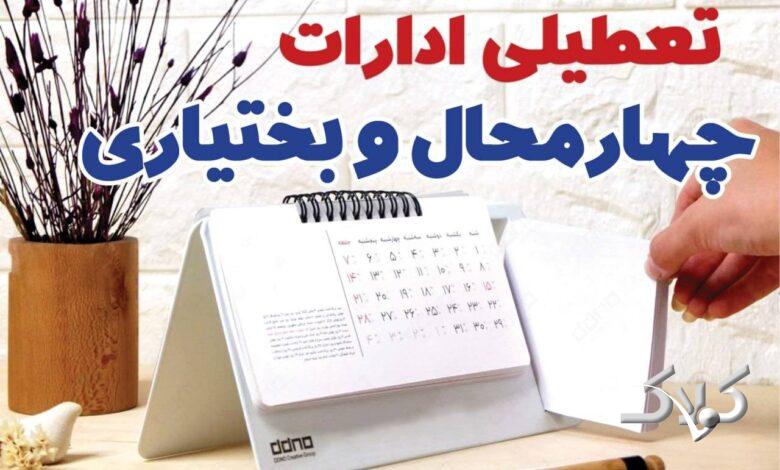 تعطیلی ادارات چهارمحال و بختیاری در روز شنبه ۲۵ بهمن ۱۴۰۴ مطلبی است که در ادامه این خبر به آن پرداخته ایم.