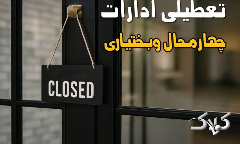 وضعیت تعطیلی ادارات استان چهارمحال و بختیاری را در روز شنبه ۱۵ آذر ۱۴۰۴ و تعطیلی ادارات شهرکرد شنبه را می توانید در این خبر بخوانید.