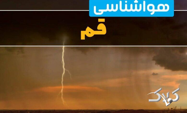 برای استان قم پیشبینی میشود که در روز چهارشنبه، سوم دی ماه، آسمان با ابرهای پراکنده همراه باشد که به تدریج کنار رفته و فضایی آفتابی در طول روز ایجاد میشود. حداکثر دمای هوا در این روز به ۱۰ درجه سانتیگراد میرسد و بادی با سرعت ۷ کیلومتر بر ساعت از سمت شمال-شمال شرقی میوزد. احتمال بارندگی بسیار کم و در حدود ۲۵ درصد است. پوشش ابری صبحگاهی نیز حدود ۶۴ درصد پیشبینی میشود. با فرا رسیدن شب، آسمان غبارآلود شده و حداقل دما تا ۴ درجه سانتیگراد کاهش مییابد. وزش باد از سمت غرب با سرعت ۹ کیلومتر بر ساعت ادامه خواهد داشت و پوشش ابری به حدود ۱ درصد میرسد.