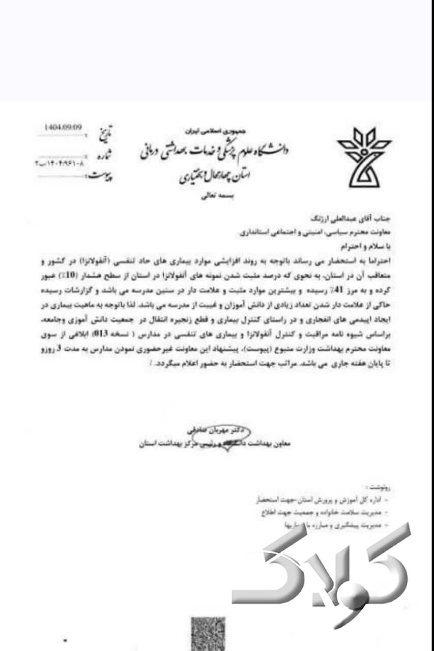 معاونت بهداشت دانشگاه علوم پزشکی چهارمحال و بختیاری باتوجه به روند افزایشی موارد بیماری های حاد تنفسی(آنفلوانزا) در کشور و متعاقب آن در استان و عبور درصد مثبت شدن نمونههای آنفلوانزا در استان از سطح هشدار پیشنهاد غیرحضوری شدن مدارس استان تا پایان هفته را به استانداری ارائه کرد!
