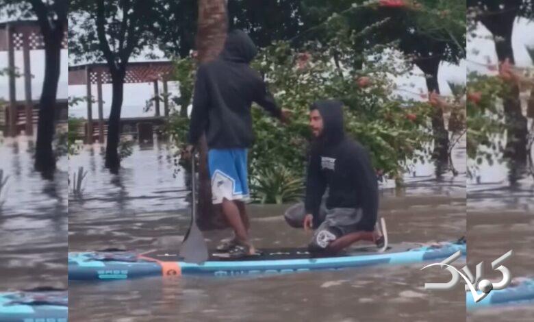 پدلسواری جوانان کیش در آبگرفتگی خیابان جزیره + ویدئو